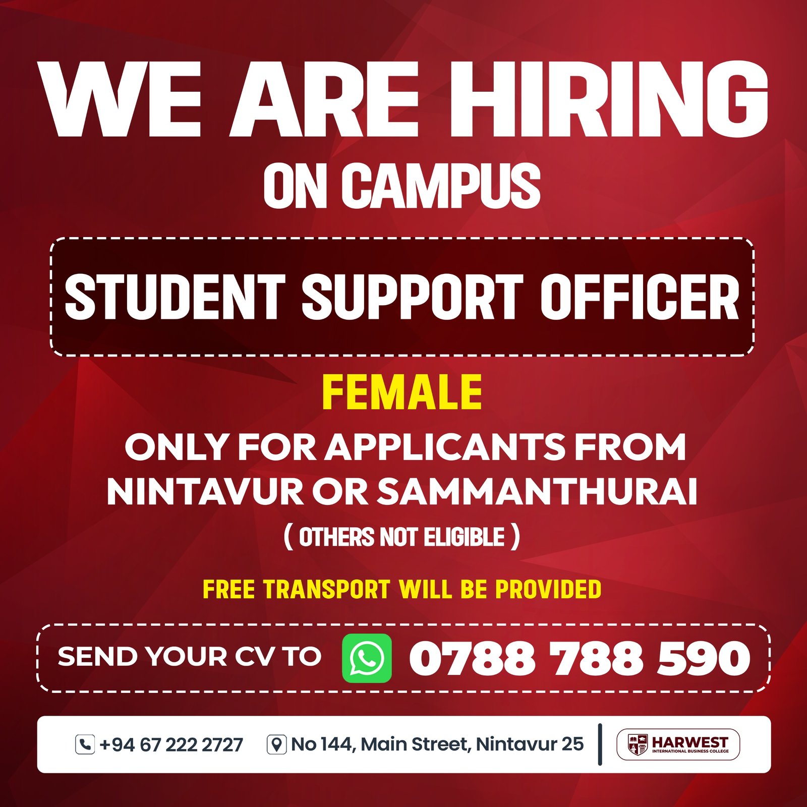 #HarwestInternationalBusinessCollege #StudentSupportOfficer #AdminJob #FemaleVacancy #NintavurJobs #SammanthuraiJobs #EducationSectorJobs #CampusJobs #Recruitment #VacancySL #JobOpportunity #AdminCareers #OfficeJobsSL #ApplyNow #HIBC